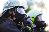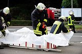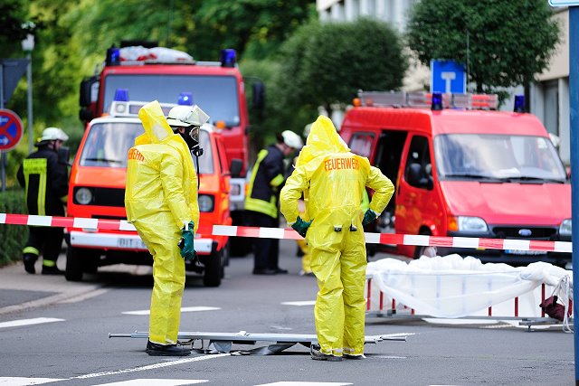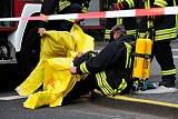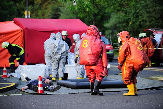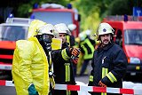 Mittlerweile wurde die Alarmstufe erhöht und der Gefahrstoffzug des Eifelkreises Bitburg-Prüm alarmiert. Diese befreiten dann unter schweren Chemikalienschutzanzügen die Insassen aus dem LKW. Die Kräfte des Gefahrstoffzuges hatten unterdessen eine Dekontaminationsanlage aufgebaut um die eingesetzen Kräfte die im unmittelbaren Gefahrenbereich arbeiteten zu dekontaminieren.