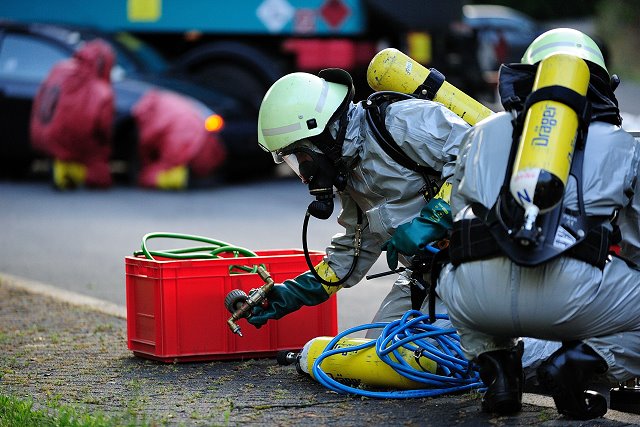 Nach erster Lageerkundung stellte sich heraus, das der LKW eine gefährliche Ammoniaklösung geladen hatte. Circa 50 Liter der Lösung liefen aus und mussten aufgefangen werden. Zwei Personen waren im LKW eingeklemmt, zwei weitere Personen im PKW. Unter leichten Chemikalienschutzanzügen wurden die zwei Insassen des PKW schnell befreit und aus dem Gefahrenbereich gebracht.