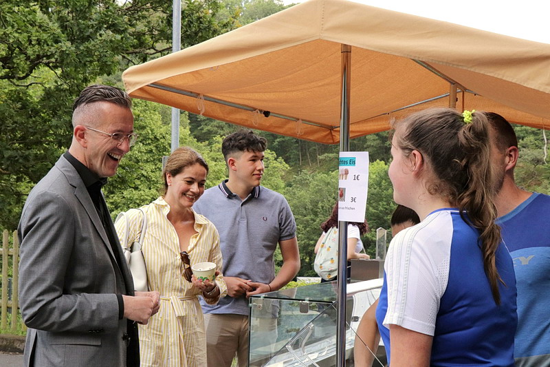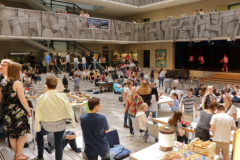 Bei herrlichem Sonnenschein und jeglichen Wettervorhersagen zum Trotz hieß es auch in diesem Jahr wieder: „Herzlich Willkommen auf unserer Schulkirmes“! Traditionell begrüßte Dr. Jens Kemper als Leiter der Schule die Gäste, die sich in großer Zahl pünktlich zum Fest „ihres“ Staatlichen Eifel-Gymnasiums im Atrium eingefunden hatten, und eröffnete damit einen Tag voller Aktivitäten und Köstlichkeiten.