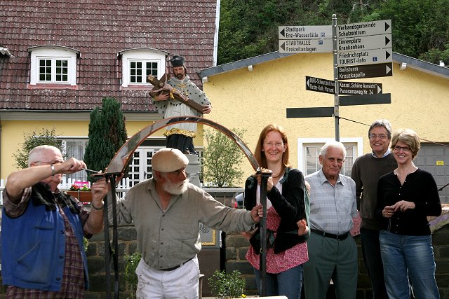 Hochrangige Assistentin mit fleißiger Handreichung Die Wochenmitte nach Pfingsten zeigte Norb und Jupp voll in Aktion auf der Brücke; die neu gestaltete Figur mitsamt Schutzdach wird fachgerecht in den Brückenmauersockel eingesetzt. Touristen bleiben stehen und halten das Geschehen im Bild fest. Als Handlangerin assistiert eine junge Praktikantin, kein Geringerer als Stadtbürgermeisterin Anna Kling. „Hand in Hand mit meinen Bürgern!“, lautet ihr Kurzkommentar. Sie will kein Aufhebens, doch es häufen sich die neugierigen Fragen, ob sie wirklich die Stadtchefin sei. Es kamen auch Einheimische vorbei, hielten inne und sorgten dafür, dass es sich nicht um eine „trockene Baustelle“ handelte.