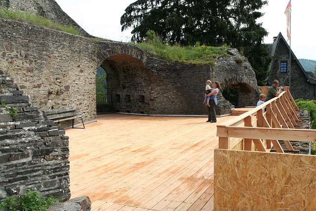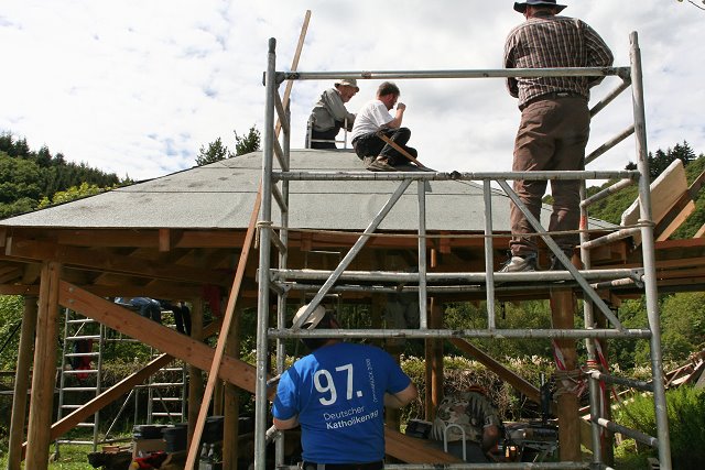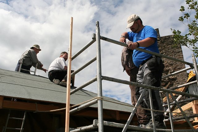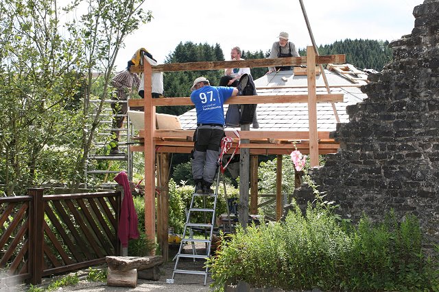 Auch in diesem Jahr fanden wieder rund 50 Frauen, Männer und Jugendliche des Jugendbundes aus ganz Deutschland den Weg nach Neuerburg. In der vergangenen Woche wurde die im vergangenen Jahr errichtete Grill-Überdachung im Bereich der Südwest-Bastion mit Schiefer gedeckt, so wie die Decke zum ersten Obergeschoss der Nord-Bastion neu abgedichtet und der Boden mit neuen Planken belegt. Von hier hat der Besucher eine beeindruckende Aussicht über das mittelalterliche Städtchen einerseits und über Burghof und Burganlage andererseits.