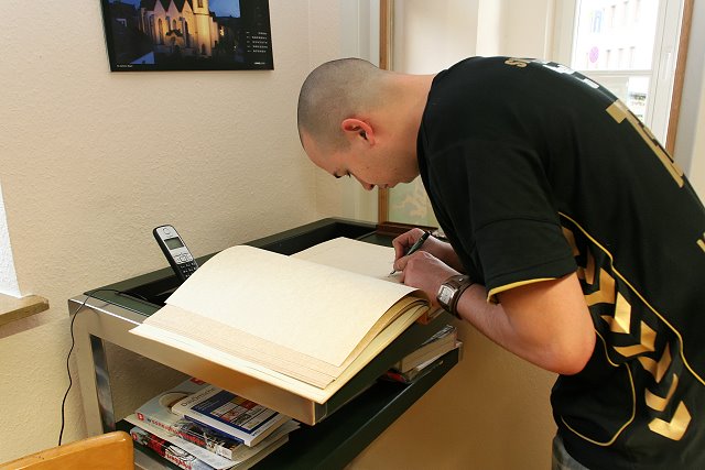 Als Dankeschön für die Einladung überreichte das Team einen von allen Spielern unterschriebenen Handball sowie einen Blumenstrauß. Anschließend durften sich alle Spieler und Verantwortlichen in das „Goldene Buch“ der Stadt Neuerburg eintragen. Der Abend klang dann gemütlich bei Pizza und kalten Getränken im Stadthaus aus.
