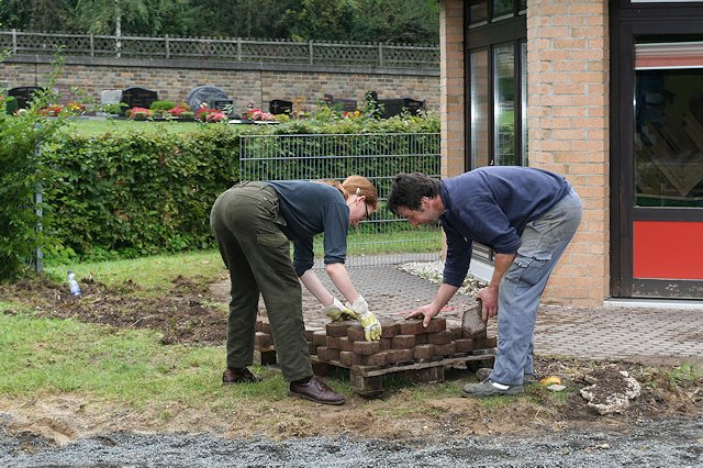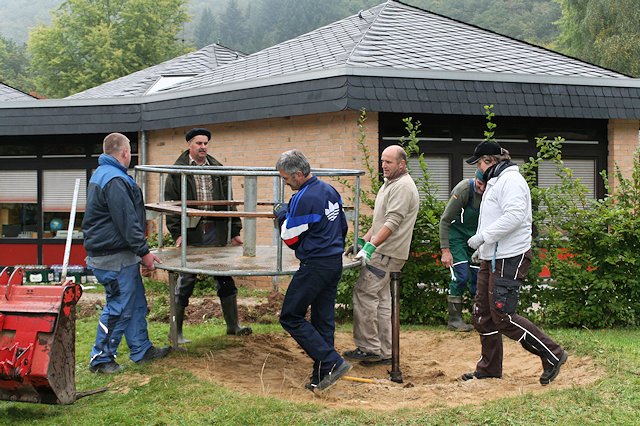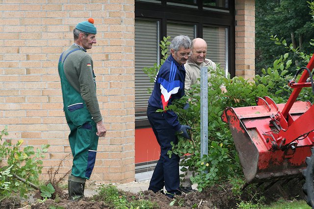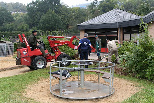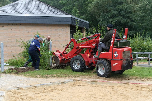Dank der tatkräftigen Unterstützung aus den an der Kita Neuerburg beteiligten Ortsgemeinden sowie der Stadt Neuerburg konnten am 22. und 29. September Kosten von rund 6000 Euro durch verschiedene Eigenleistungen eingespart werden. Zur Vorbereitung der anstehenden Baumaßnahme wurde im Außenbereich die Zaunanlage mit Hecke zurückgebaut und versetzt, es wurde Pflaster aufgenommen und ein Sandkasten entfernt, verschiedene Spielgeräte wurden abgebaut oder versetzt.
