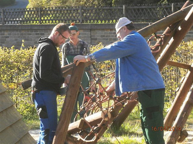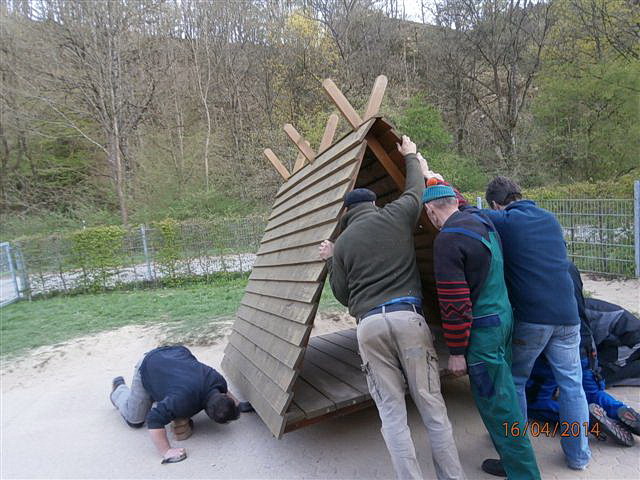 Am Mittwoch, dem 16. April begannen die Arbeiten. Die Ortsbürgermeister und Vertreter aus den Gemeinden Emmelbaum, Plascheid, Muxerath, Berkoth, Scheuern und Koxhausen rückten mit „schwerem Gerät“ den alten Spielgeräten der Kita Neuerburg zu Leibe. So wurden das Klettergerüst im Eingangsbereich und das Spielgerät auf dem Kleinkindspielplatz in ihre Einzelteile zerlegt. Ebenfalls wurde das Holzindianderzelt in den hinteren Spielbereich versetzt. In weiteren Außenaktionen werden zukünftig noch die nötigen Erdarbeiten und natürlich der Aufbau der neuen Spielgeräte im Fokus stehen.