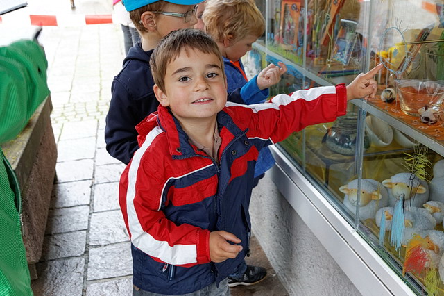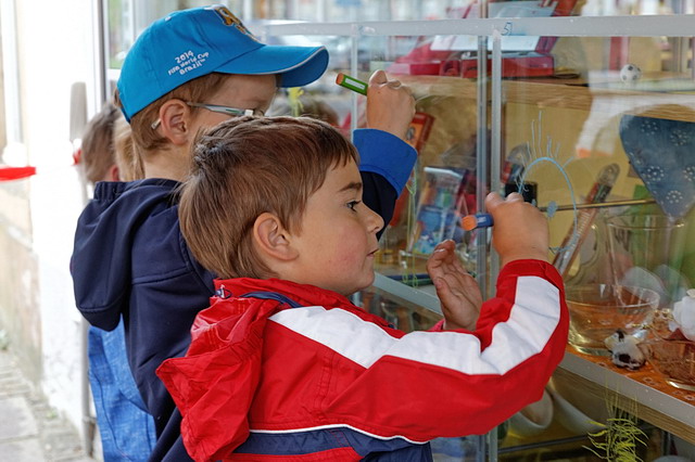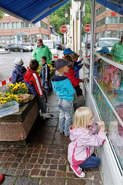 Die Neuerburger Kindergartenkinder, die auch liebevoll Berghofkinder genannt werden, da die lieben Kleinen des Öfteren mit den Bewohnern des Seniorenhauses Berghof singen, hatten am Montag den 26.05.2014 einen besonderen Tag. Die 14 Kinder durften das, was sie Zuhause wohl vorher noch nicht tun durften: eine ganze Schaufensterscheibe bemalen und gestalten mit dem Thema „Frühling“ !
